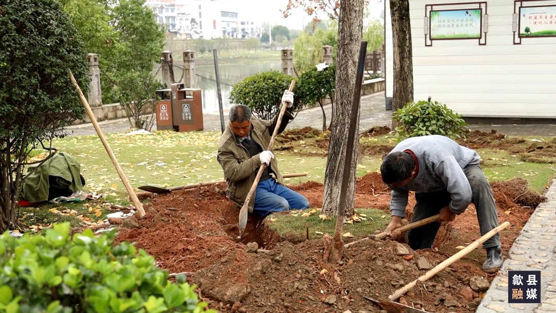 12月2日,在徽州古城新型基础设施提升项目现场,记者看到,多景园公园已经开始了封闭施工,一排绿色的围挡将公园与马路隔离开来,围挡内部,施工人员正有条不紊地对公园内部分树木进行迁移。
